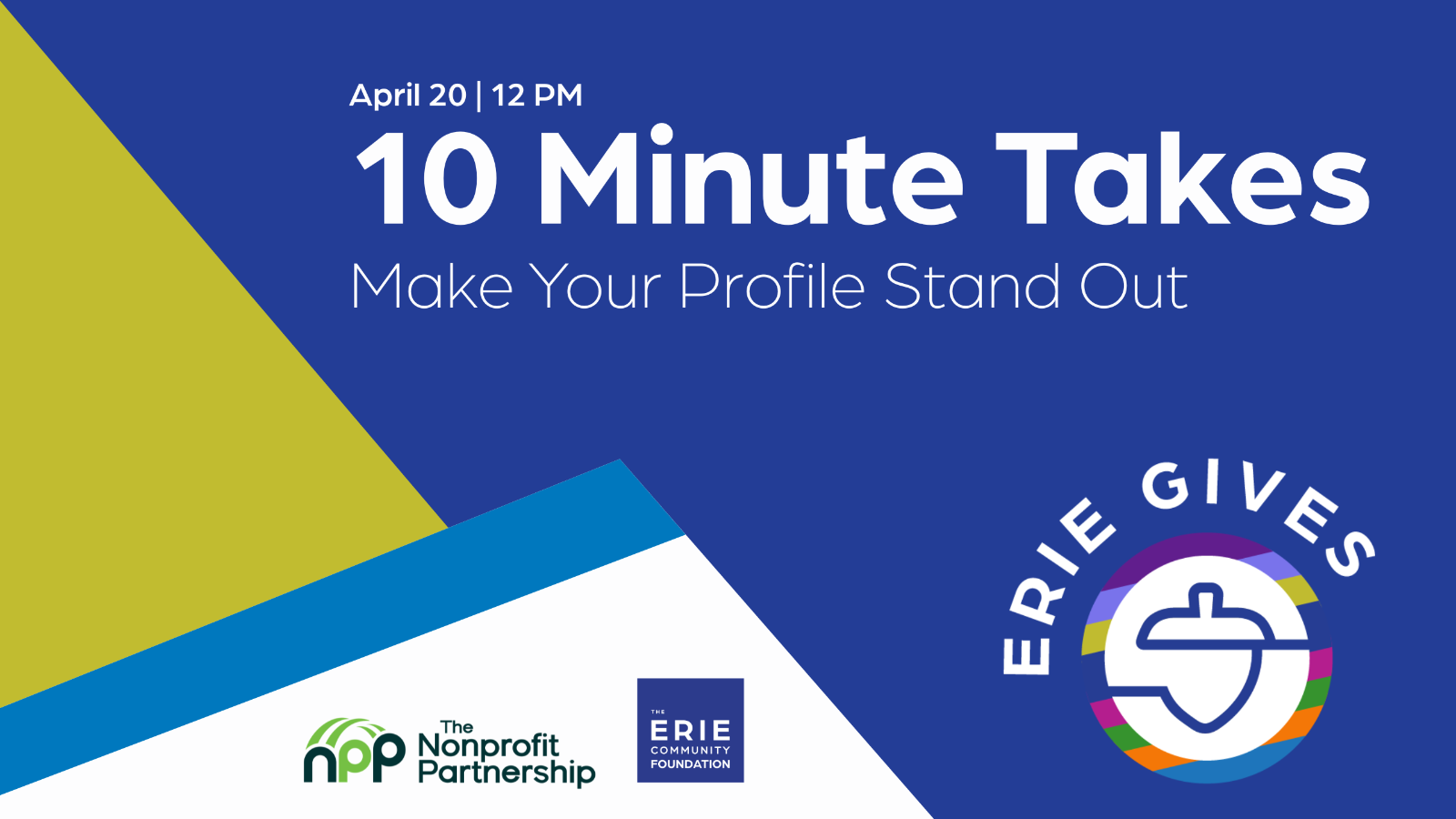 Please join The Nonprofit Partnership and The Erie Community Foundation for 10-Minute Takes: a series of virtual meeting opportunities to keep you focused on making Erie Gives 2026 the best it can be for your nonprofit.