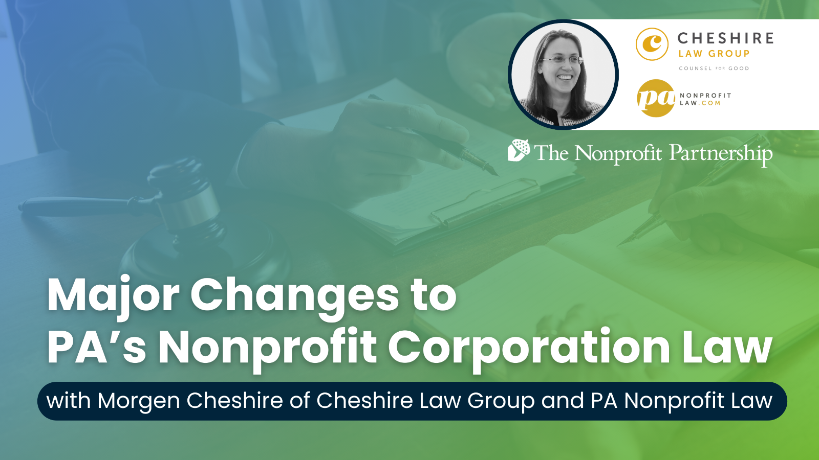 Morgen Cheshire, a lawyer for nonprofits for nearly 20 years, will help us get to the bottom line quickly about what we need to know about these new changes to the law and how they impact nonprofits. Morgen is the founder and managing attorney of Cheshire Law Group, and the managing editor of PAnonprofitlaw.com – a new legal resource offering downloadable legal tools and templates for Pennsylvania nonprofit organizations.