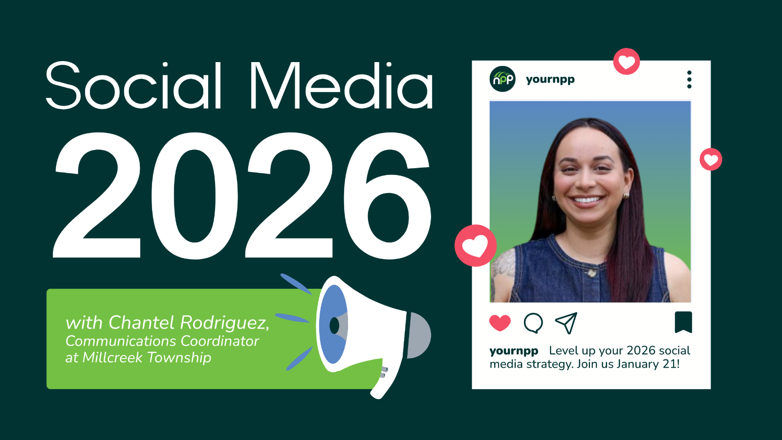 Led by Chantel Rodriguez, Communications Coordinator with Millcreek Township, this session will break down the biggest shifts in the 2026 social landscape and offer practical strategies to keep your nonprofit ahead of the curve. Whether you're an experienced social media pro or just getting started, you’ll leave informed, inspired, and ready to strengthen your digital presence. Don’t miss this chance to elevate your nonprofit’s social strategy for the year ahead!